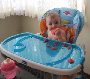 1- Kendi elinle erik, karpuz, bisküvi vb pek çok gıdayı gayet güzel yiyebiliyorsun. Annen kendi başına yemek yeme çabalarını desteklemek için günde en az 4 kez mama sandalyeni, seni ve yerleri baştan aşağı silmek/yıkamak durumunda kalıyor ama olsun. Yaz mevsiminde olmamız ve senin suyu çok seviyor olman duş seanslarımızın hızlı ve keyifli olmasını sağlıyor, yıkadığımız/sildiğimiz her şey de çabucacık kuruyor bakalım kışın ne yapacağız?